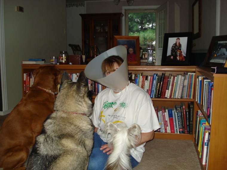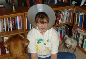 I tried on the “Cone of Shame”. (Does that make me “game” or nutty?) The dogs were very concerned as you can see. All 3 sat in front of me and Chloe whined and breathed hard in my face every time I turned her way. It was very disconcerting to not be able to see around.