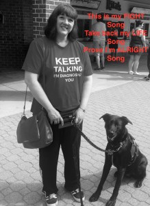 I forced my brain to verify the leash was actually still in my hand. YUP! I opened my eyes and focused for a second. Chloe went into a down/stay on her own and rested her head on my shoulder. The weight of my ding-a-ling service dog’s head was a comfort.